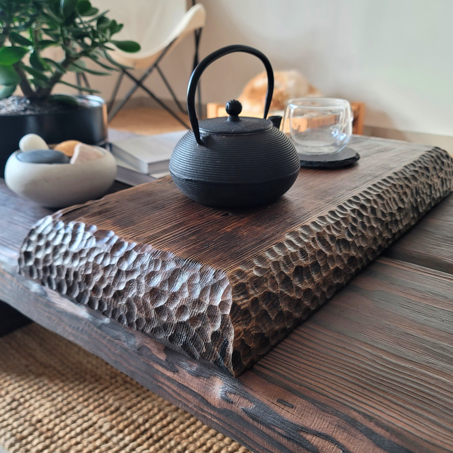 This piece embodies the Wabi Sabi principle of embracing natural materials. The wood's grain tells its own story, with each knot and line adding character and depth.